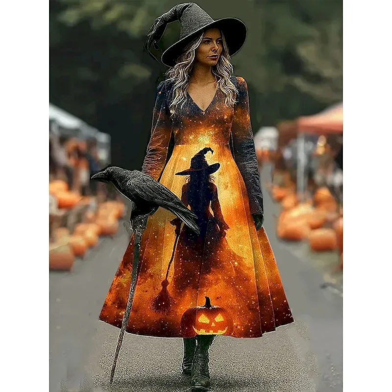 Halloween Women’s Witch Print Midi Dress A Line Dress Vacation Casual Daily Regular Fit Floral Graphic Hocus Pocus Long Sleeve V Neck Black Red Brown Spring Fall