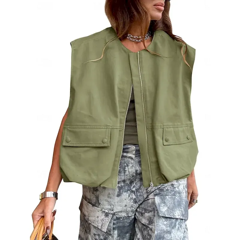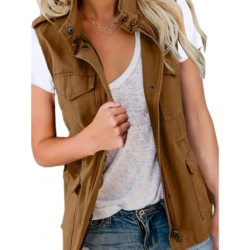 Women’s Casual Jacket Comfortable Breathable Zipper Pocket Fashion Casual Solid Color Vacation Street Casual Daily Wear Zipper Short Stand Collar Regular Fit Sleeveless Outerwear Black White Khaki
