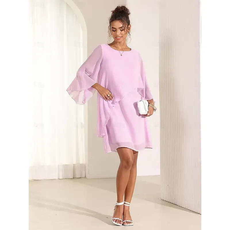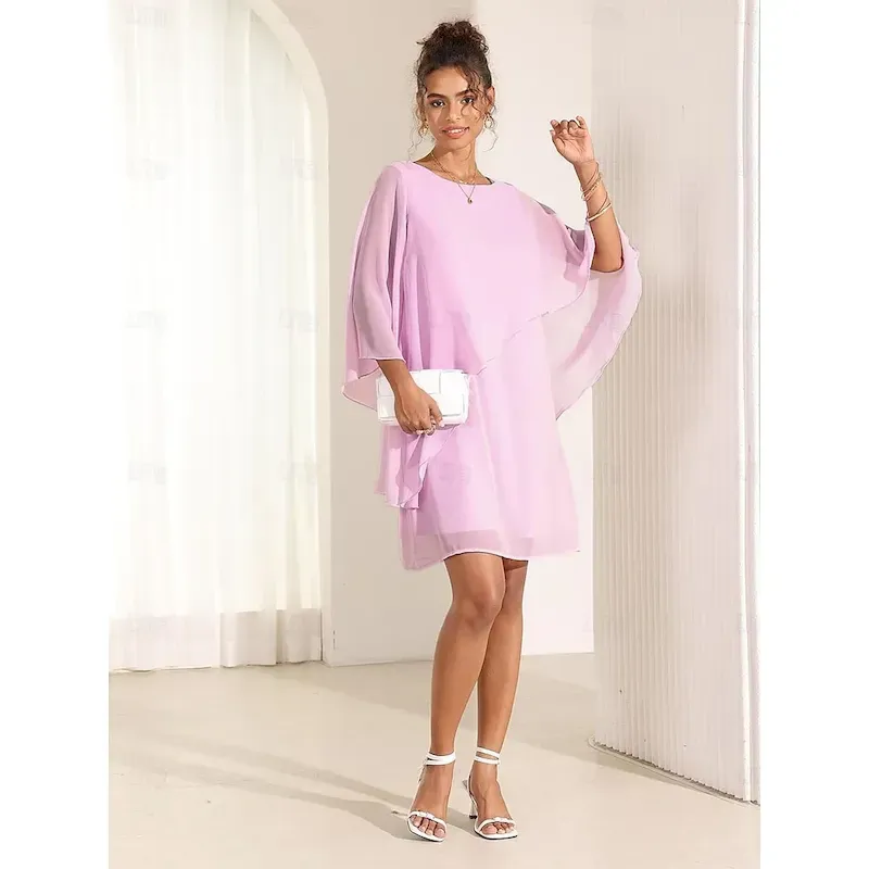 [Fabric] Expertly crafted from lightweight chiffon, this dress offers a delicate and airy feel, perfect for staying cool and stylish during the summer months. The chiffon overlay adds an ethereal and sophisticated touch to the garment.[Fit] Designed with a regular fit, this A-line dress provides a loose and relaxed silhouette, ensuring comfort while maintaining a chic appearance. Its above-knee length further enhances its versatility, making it suitable for both casual and semi-formal settings.[Design Highlights] This vintage-inspired dress features flowing cape sleeves that add a dramatic flair, while the simple crew neckline complements the overall elegance of the design. The asymmetrical, tiered ruffle details enhance the dress’s graceful movement, making it a standout piece in any wardrobe.[Occasions] Ideal for cocktail parties, weddings, and other special occasions, this dress is a lovely choice for those looking to make a subtle yet impactful statement. Its elegant design allows it to be easily paired with heels for a formal event or dressed down with flats for a more casual gathering.[Size Range] Available in a variety of sizes from S to XXL, this dress caters to a range of body types, offering options in soft pink, blue, and green hues to suit personal style preferences.OK