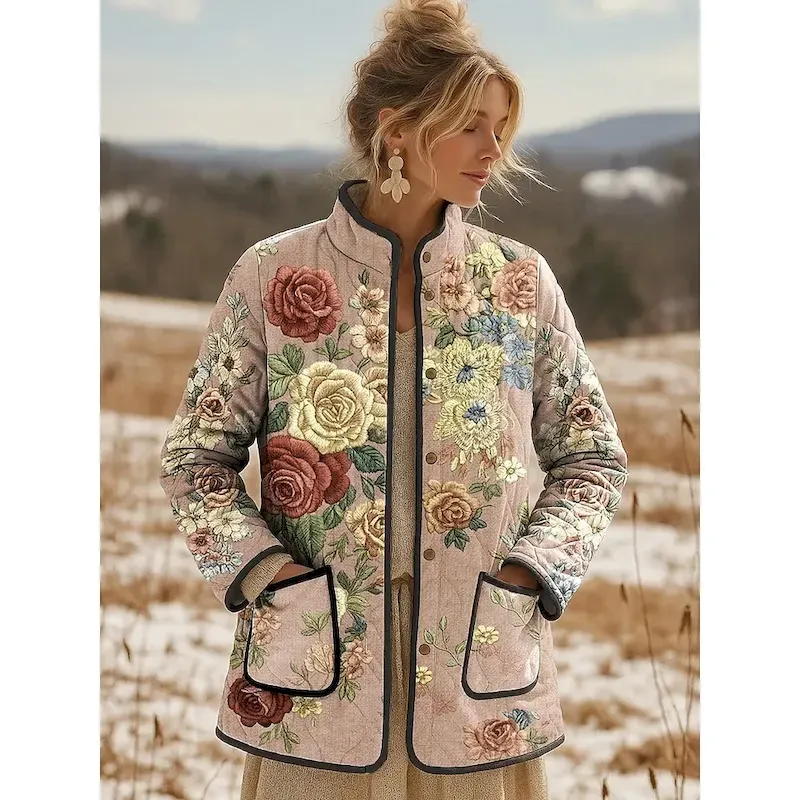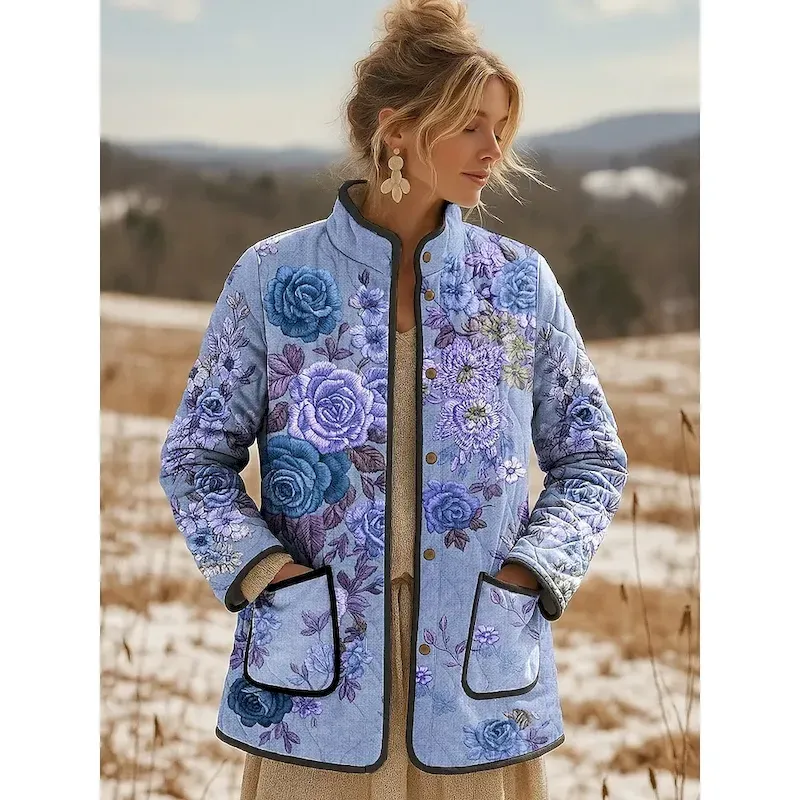 Women’s Winter Jacket Quilted Jacket Warm Lightweight Print Active Vintage Cute Artistic Floral Casual Regular Stand Collar Regular Fit Long Sleeve Outerwear Pink Blue Purple Fall Winter